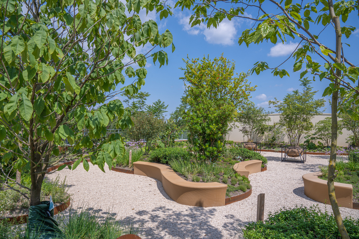 Neben seinem ästhetischen Wert dient dieses Dach auch einem experimentellen und pädagogischen Zweck. So wurden beispielsweise 3-D-gedruckte Bänke installiert, die aus recycelten Töpfen der Gärtnerei gedruckt wurden. Dies unterstreicht die Nachhaltigkeit und den Kreislaufgedanken des Unternehmens. In Zusammenarbeit mit The Urban Jungle Project wurden leichte Plug-and-Play-Bäume installiert, die in einem Stahlwürfelrahmen aufgehängt sind, der für Dächer mit geringer Tragfähigkeit geeignet ist. Die Basis des Substrats besteht aus leichtem Glasschaum, aus dem die Erdhügel in der Mitte und entlang des Randes errichtet wurden. Um das Gewicht der Bäume zu verteilen, wurde eine Kreuzstruktur angefertigt, in der die Bäume verankert wurden. Für Pflanzen, die sauren Boden bevorzugen, wurde ein separater Bereich mit Dachsubstrat ohne alkalische, mit Torf angesäuerte Lava eingerichtet.