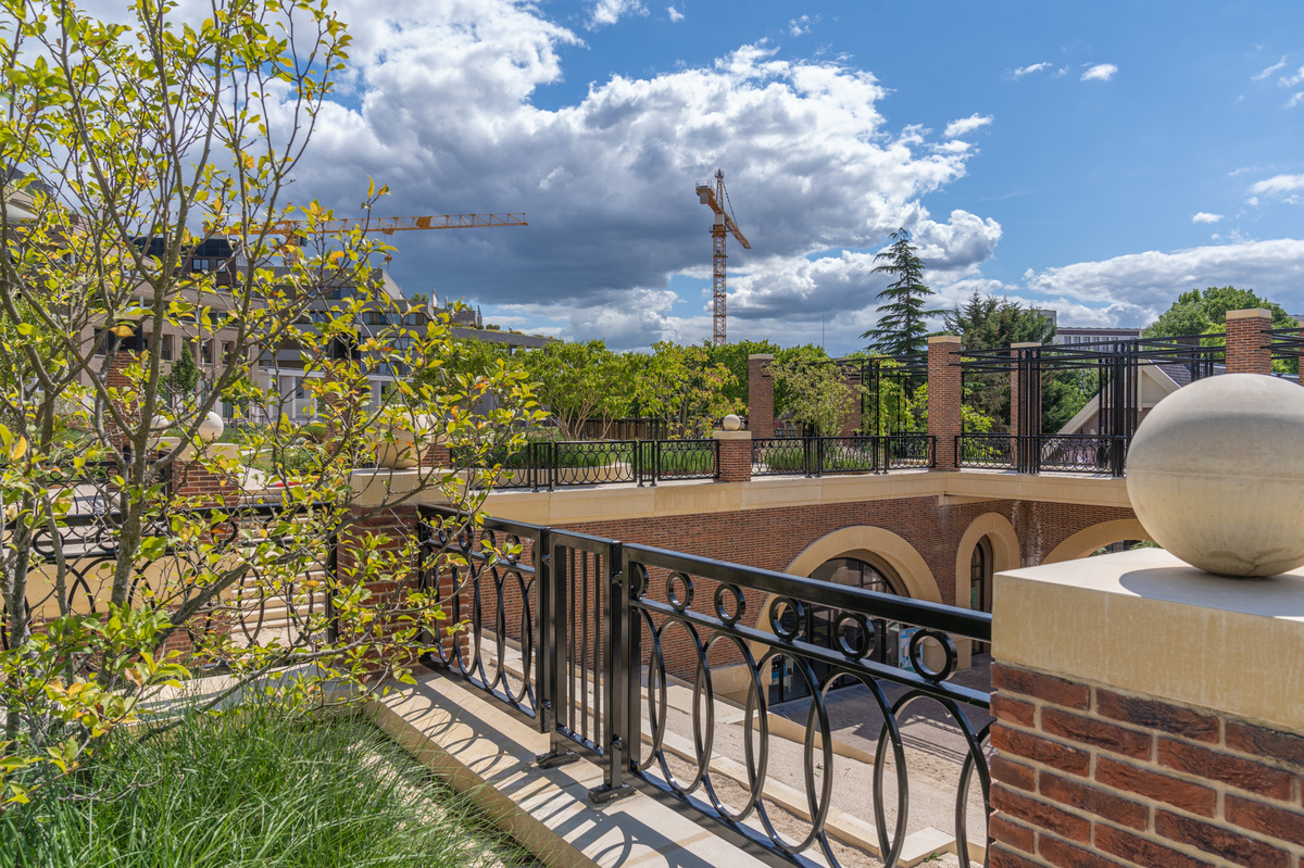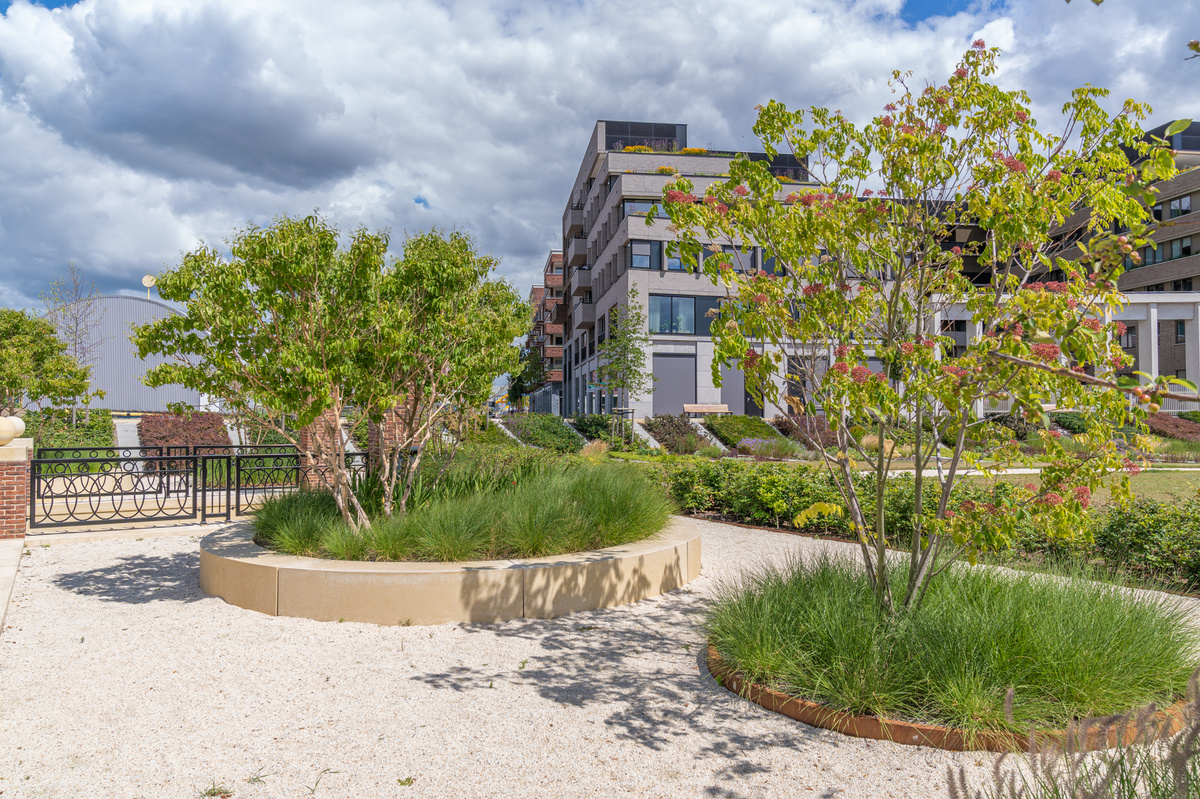 Obwohl der Park mitten in einem belebten Wohngebiet liegt, wirkt er weitläufig und grün. Dies ist vor allem auf die klaren Linien im Design und die perfekt ausgewogene Auswahl der Pflanzen zurückzuführen. Das auffälligste grüne Element ist die doppelte Reihe von Lindenbäumen, die eine riesige natürliche Mauer bilden.