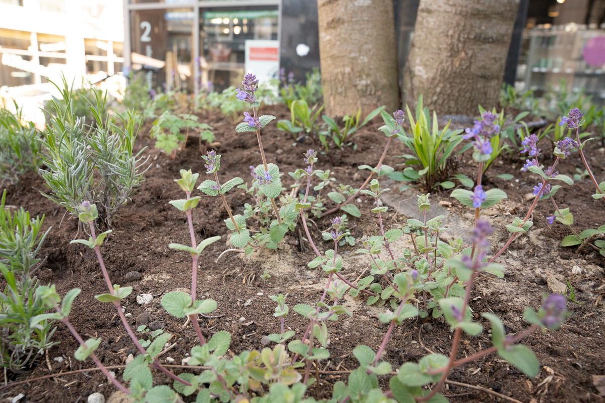 Es wurden verschiedene Arten von robusten Mülleimern aufgestellt, die jeweils eine eigene Größe und Ausführung haben. Dies unterstreicht die Verspieltheit des Entwurfs und gibt dem Nutzer des Stadtzentrums einen Wiedererkennungswert. Die verwendeten Bäume sind eine wohlüberlegte Wahl, bei der die Baumschule Ebben eine beratende Rolle als Lieferant spielte. Es handelt sich ausschließlich um mehrstämmige Bäume bis hin zu großen Sträuchern, die niedrig verzweigt sind und eine attraktive Rinde haben. Die ausgewählten Arten sind sehr hitze- und trockenheitsresistent, was zu ihrer einfachen Pflege und ihrem hochwertigen Aussehen beiträgt. Auch die Wahl der Unterpflanzung ist nicht zufällig. Kräftige Bodendecker, die lange und reichlich blühen, unterdrücken Unkraut und sorgen für ein fröhliches Aussehen. Außerdem dichten sie das Substrat gut ab und verleihen der gesamten Bepflanzung einen sattgrünen Eindruck.
