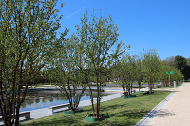Erasmus University launched the 'Campus in Development' master plan to raise the quality of the university site to a higher level and prepare the campus for the international future. The design was developed and finalised in cooperation between various parties, resulting in the opening of new accommodation for students, a vibrant pavilion and the green, living heart of the campus. In the centre of the campus, all the traffic has now disappeared below ground level and a park-like environment has been created, with a large water feature and beautiful multi-stem trees. Species with particular colour accents were chosen in the selection of the characteristic multi-stems, including Acer ×freemanii ‘Jeffersred’ (syn. ‘Autumn Blaze’), with a fantastic fire-red autumn colour and Prunus serrula, with the red-brown peeling bark so typical of this species.