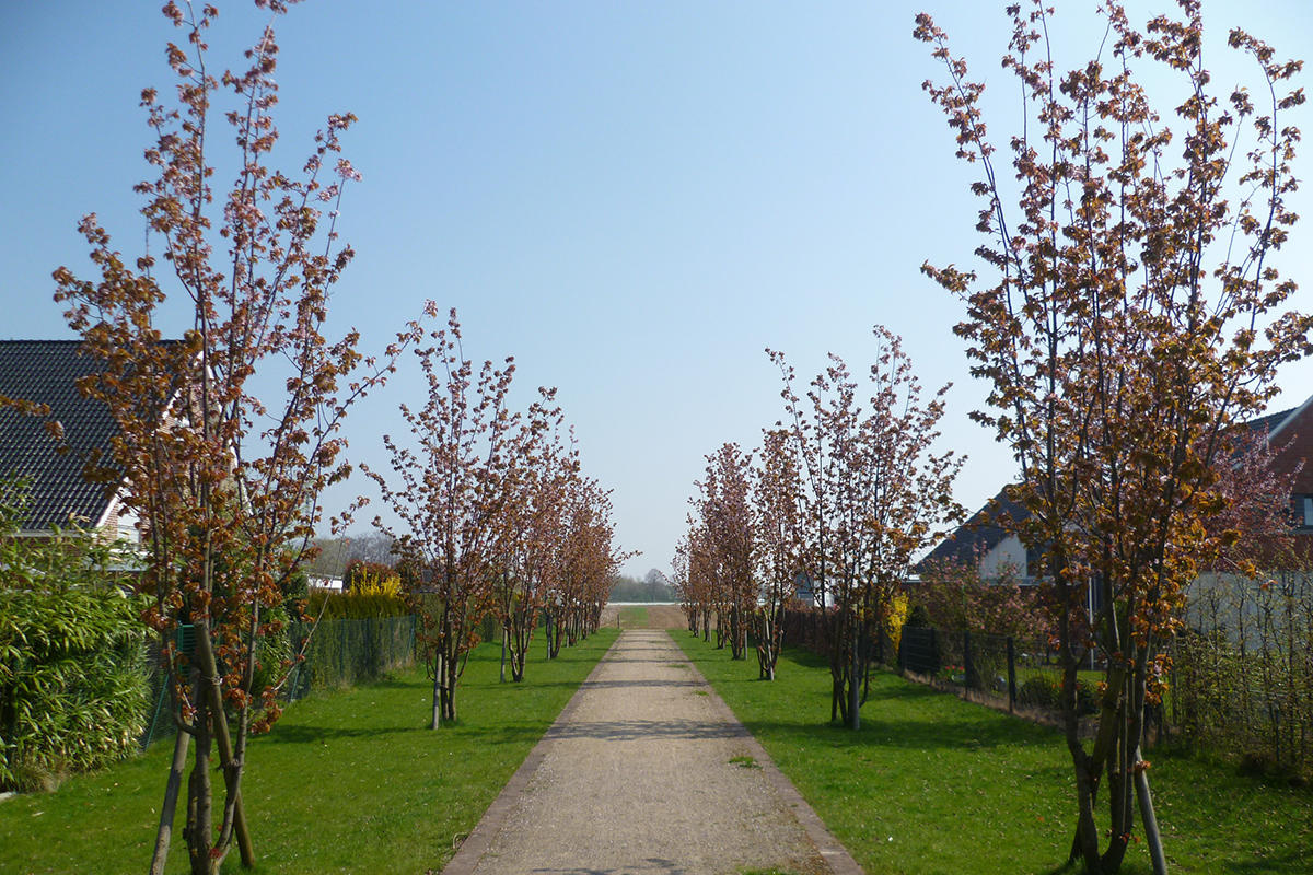 Seventy residential units were realised on a four-hectare site in the German Kempen on the Lower Rhine as part of area development. The area is literally traversed by a green corridor with a walking and cycling route. The town of Kempen chose to plant multi-stemmed Prunus sargentii 'Rancho' along the entire corridor. This species was chosen because of its slender, upright growth habit, beautiful bright pink blooms in spring and spectacular red autumn colouring. The multi-stemmed trees create an avenue planting with a unique appearance.