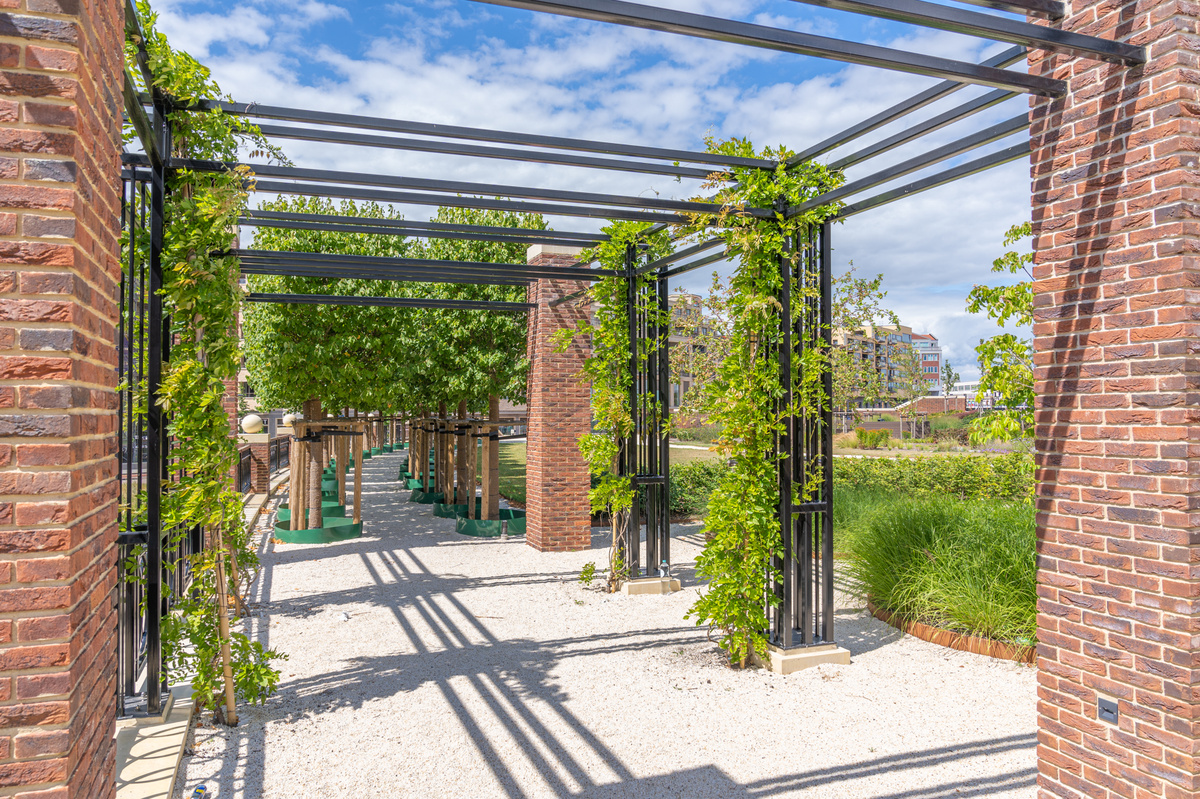 L'impressionnant mur végétal est constitué de Tilia cordata « Greenspire », plantés en bordure du parc. Cette plantation peut également être considérée comme un jardin sur le toit, car cette partie se trouve au-dessus de la galerie du bâtiment et fait partie du parc. Afin de créer suffisamment d'espace pour la croissance des racines des arbres sur ce toit, les poutres de construction du bâtiment ont été placées sur le toit. Cela a permis de gagner beaucoup d'espace. Grâce à une bonne préparation du système racinaire des arbres, il a été possible de créer rapidement l'image verte et fermée souhaitée, malgré le volume racinaire limité.