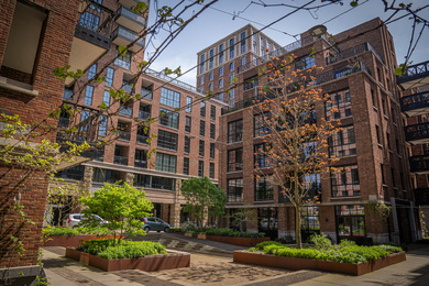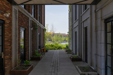 La conception de Little C consiste en une zone résidentielle compacte, agencée de manière à permettre aux résidents de se rencontrer régulièrement. Ainsi, l’aménagement du paysage et l’architecture des bâtiments jouent un rôle crucial et sont étroitement liés. L’espace public entre les bâtiments a été entièrement conçu dans la foulée et s’harmonise dès lors avec les bâtiments en termes de matériaux, d’utilisation des couleurs et d’aspect industriel. À cet égard, les concepteurs ont d’emblée misé sur l’utilisation de nombreux points de verdure publics afin de donner au quartier un caractère intime et agréable. La configuration de base du quartier, avec ses ruelles, ses places et ses passages, constitue une bonne base sur ce plan. Ceci est souligné par la plantation d’arbres multi-troncs de grand format grâce auxquels les bâtiments résidentiels ont été directement nichés dans un environnement vert à maturité après l’achèvement des travaux.