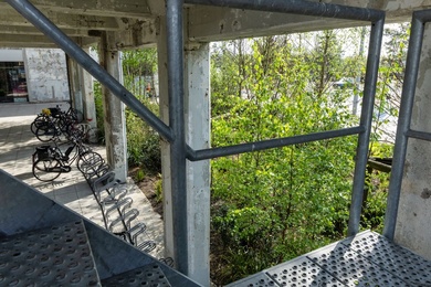 Les arbres et autres plantations enrichissent l'environnement de travail, contribuent au bien-être des utilisateurs et créent une atmosphère agréable, informelle et inspirante. L'espace extérieur et le couloir sont aménagés avec des espèces locales, notamment des pins sylvestres, des chênes, des bouleaux, des genêts, des fougères et des graminées, ce qui donne un paysage sauvage et boisé qui s'harmonise parfaitement avec le bâtiment. L'utilisation d'arbres de grande taille permet de créer immédiatement cette image forte et donne l'impression d'un paysage qui a toujours été là. Rien ne trahit la construction récente. L'aménagement vert de ce bâtiment est le fruit d'une collaboration intensive, de l'idée à la réalisation, et constitue le prélude à une végétalisation accrue du parc d'activités dans les années à venir.