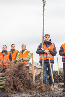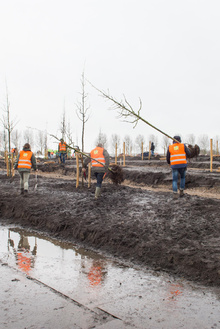 Vijfhuizen, 18 maart 2017. Het is echt Hollands weer, nat en guur. Vroeg in de ochtend komen medewerkers van Boomkwekerij Ebben aan bij het monument. De bouwwerkzaamheden zijn nog niet helemaal afgerond, maar het is al goed te zien wat het gaat worden. De vorm van het herdenkingslint is zichtbaar, de plantplaatsen zijn gereed, de boompalen zijn gezet en paden zijn tussen de bomen aangelegd.