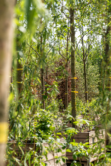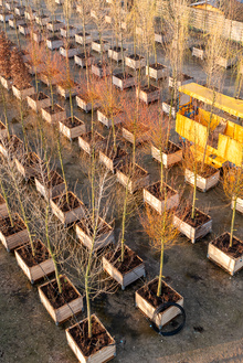 In februari van dit jaar zijn de 101 verschillende boomsoorten gerooid en in houten fruitkisten gezet. De Malus ‘Mokum’ en Ulmus ‘Amsterdam’ zijn binnen deze soorten een bewuste knipoog naar de stad Amsterdam. Het toepassen van verschillende boomsoorten levert aantoonbare meerwaarde op voor de leefomgeving. Het vergroot de biodiversiteit, verhoogt de veerkracht tegen ziekten en plagen, en draagt bij aan een breder scala aan ecologische functies. Om de bomen binnen 4,5 maand voldoende te laten wortelen en tegelijkertijd hanteerbaar genoeg te laten blijven voor transport naar Amsterdam, werd zorgvuldig gekozen voor een licht maar voedzaam substraat. Daarnaast zijn de bomen verankerd in hun kisten, voor stabiliteit. De 7.500 kleine bomen werden vervolgens bij de grotere exemplaren geplaatst. Om de beleving van een echt bos te versterken, is een inheems wildbloemenmengsel ingezaaid met soorten die van nature voorkomen aan de bosrand. Door het extreem droge voorjaar zijn extra irrigatiesystemen aangelegd om de jonge aanplant gezond te houden.