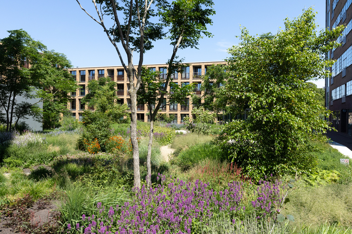 Een belangrijk onderdeel van de tuin is de toekomstbestendige opbouw. Een groot deel ligt boven op een parkeergarage, wat specifieke eisen stelt aan waterbeheer, bodemopbouw en gewicht. Om hierin tegemoet te komen is er gebruikgemaakt van een capillair irrigatiesysteem dat regenwater opvangt en geleidelijk weer afgeeft aan de bodem. Hierdoor is de tuin grotendeels zelfvoorzienend en blijft het inzetten van leidingwater minimaal. Naast een verkoelend effect helpt de beplanting ook om een deel van de hittestress af te vangen en dempt het hinderlijke geluiden; functies die in een dichtbebouwde stad als Leiden van grote meerwaarde zijn.