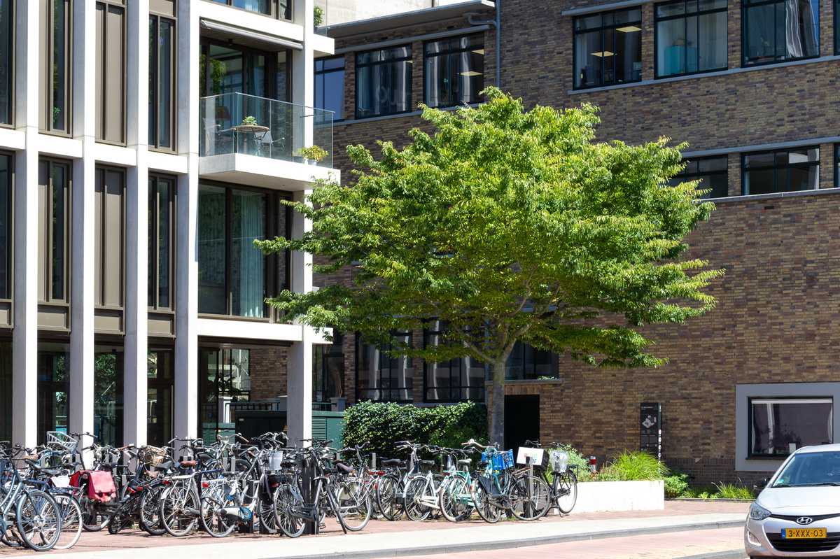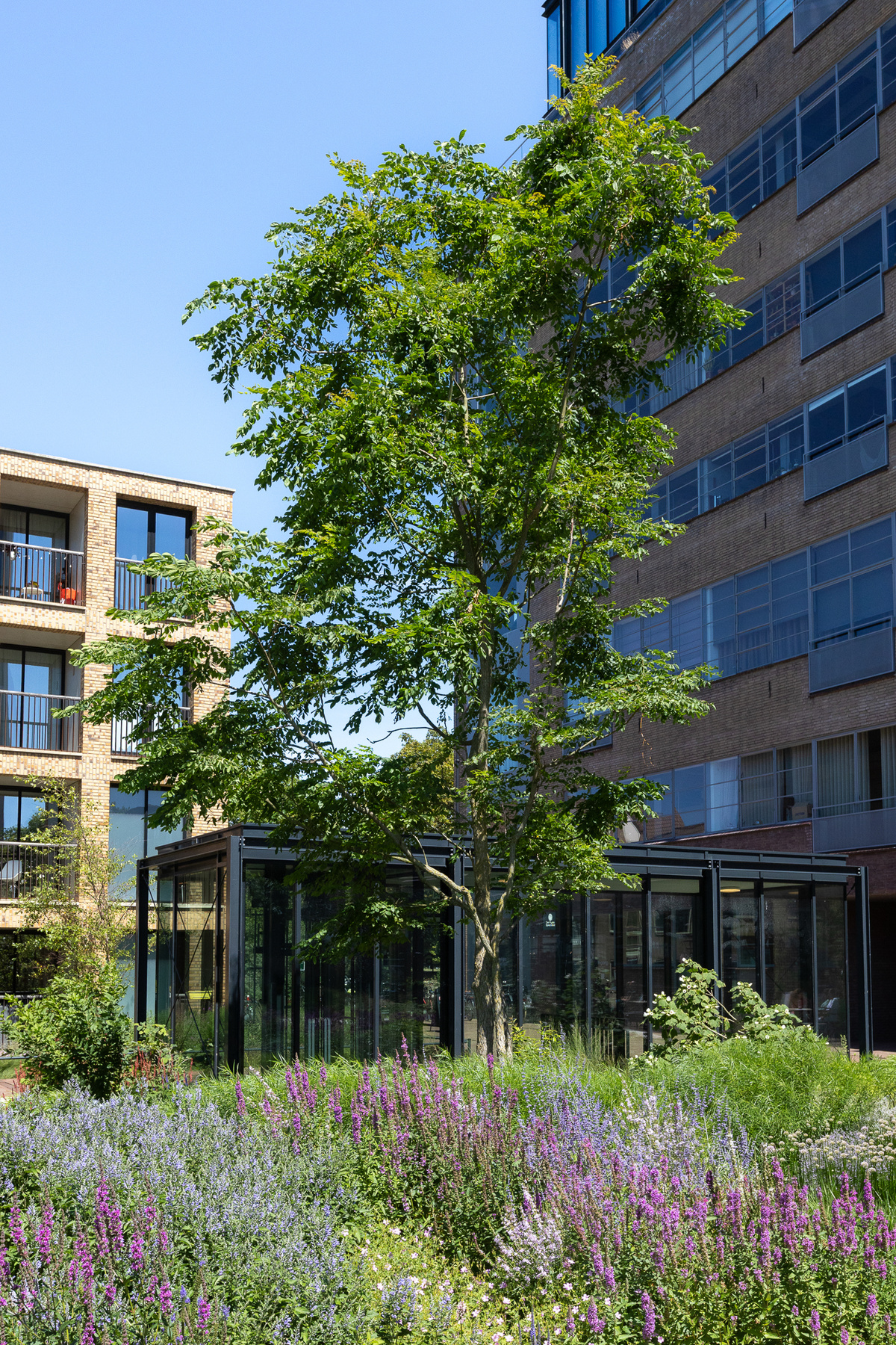 Naast bloembollen en vaste planten zijn er ook meerstammige bomen gebruikt. Door de aanwezige parkeergarage onder het maaiveld is de ruimte voor het wortelvolume beperkt. Door bomen toe te passen die hier in de opkweekfase op zijn voorbereid konden er toch exemplaren van omvangrijk formaat worden aangeplant om het geheel een volwassen aanzicht te geven. Deze combinatie zorgt voor een losse, natuurlijke uitstraling.